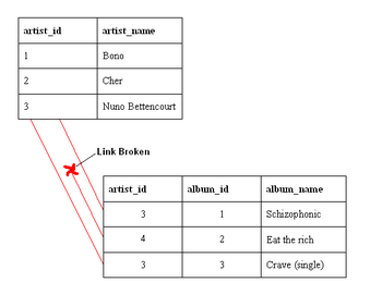 참조 무결성이란 데이터베이스의 신념 중 하나로, 예를 들어 A 테이블의 a 컬럼이 B 테이블의 b 컬럼을 참조하고 있다면 이 두 컬럼은 항상 값이 일관되어야 함을 말한다. 즉, B 테이블에서 값을 변경시켰다면 이 변경사항이 A 테이블에도 적용되어야 한다. 또한 B 테이블의 b 컬럼에 없는 값을 A 테이블 a 컬럼에서 가질 수 없다. 아래의 그림은 참조 무결성이 깨진 예시이다.