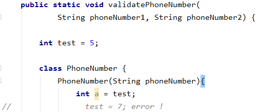 (자바 8부터는 final 뿐만 아니라 유사 final 지역변수에도 접근이 가능하다. 유사 final이란 final이라는 키워드는 안붙었지만 초기화된 이후에 절대 바뀌지 않는 변수나 매개변수를 말한다. 아래의 경우 test는 final로 선언되지 않은 지역변수이기 때문에 Java 8 이전에는 PhoneNumber 클래스에서 사용할 수 없었지만, 코드에서 test의 값을 수정하지 않는 경우 effectively final(유사 final)로 인정하여 compile 에러가 발생하지 않는다. 하지만 "test = 7;"과 같이 test의 값을 수정하려고 하면 에러가 발생한다.)