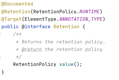 @Retention 어노테이션을 어떻게 저장할지를 명시하는 어노테이션이다. 이 어노테이션은 value라는 element에 RetentionPolicy 타입을 줄 수 있다.