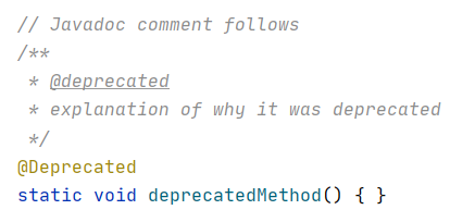 @Deprecated 이 어노테이션은 더이상 사용하지 않기를 권고하는 element에 붙인다. 이 어노테이션이 붙은 메소드나 클래스 또는 필드를 사용하면 컴파일러가 경고한다. element가 deprecated될 때 아래와 같이 Javadoc @deprecated 태그를 통해 문서화되어야 한다.