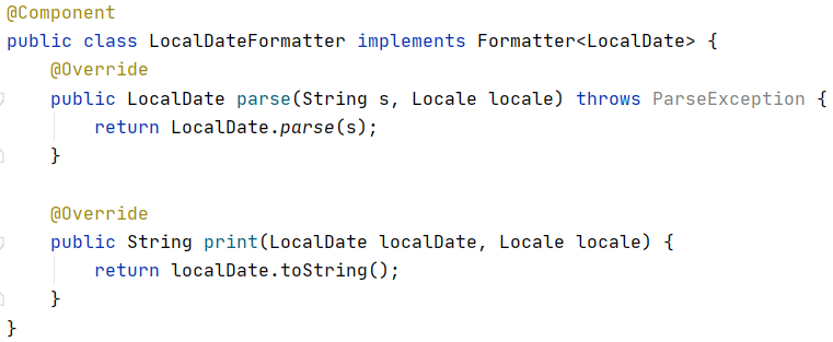 결과는 실패. 메소드 인자 타입이 맞지 않아서 문제가 되었다고 하니 String을 LocalDate 타입으로 변환해주는 게 default로 설정되어있지는 않은가 보다. LocalDate 타입 정도는 등록되어있을 줄 알았기 때문에 살짝 당황했다. 그래서 Formatter를 만들었다. Formatter 만들어 등록하면 String과 Object 간의 변환이 가능해지기 때문이다.