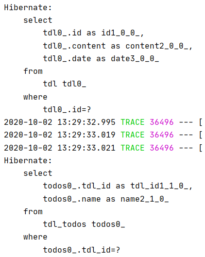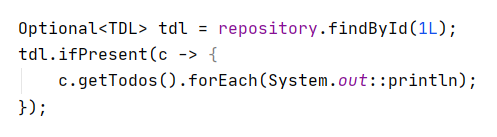 디폴트로 lazy 타입이 설정되어 있다. 데이터베이스에 저장되기를 TDL은 ToDo에 대한 정보 없이 깨끗하게 저장되므로 TDL을 요청했을 때 TDL만 가져오는 게 자연스러운 것 같다. 확실히 하기 위해서 이번엔 가져온 TDL에서 ToDo 리스트에 대한 정보를 요청해보았다.
