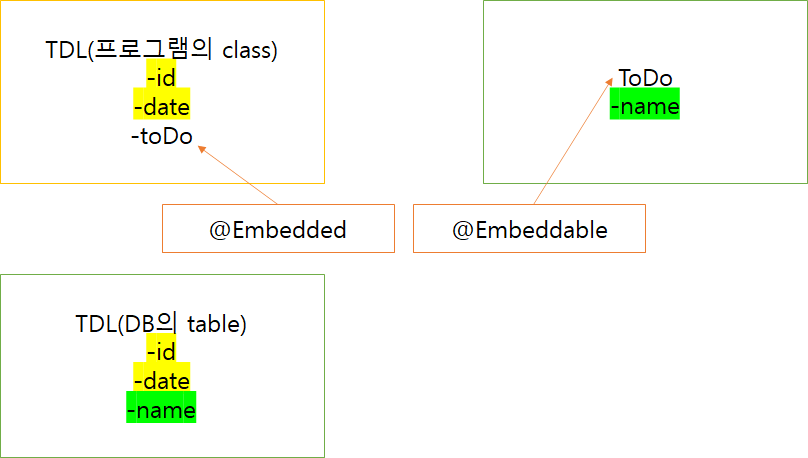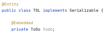 TDL에는 다음과 같이 ToDo 타입 프로퍼티 위에 @Embedded를 붙여준다. 이와 같이 하면 프로그램에서는 두 개의 클래스를 따로 두면서 데이터베이스에는 TDL 테이블 속에 ToDo의 모든 프로퍼티가 모두 들어가 있는 상태가 된다. 예를 들어 TDL에 '날짜' 프로퍼티가 있고, ToDo에는 '이름' 프로퍼티와 '우선순위' 프로퍼티가 있다면 데이터베이스에는 TDL의 테이블 속에 날짜, 이름, 우선순위가 모두 들어가게 된다.