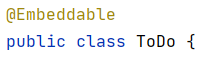 ToDo에 @Embeddable을 붙인다. 다른 클래스의 Embedded 프로퍼티로 사용될 클래스임을 알리는 어노테이션이다. @Entity는 붙이지 않는다. Embedded이므로 독자적인 테이블을 갖지 않기 때문이다.