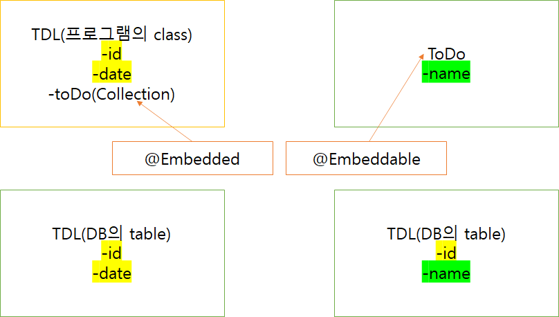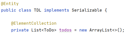 가장 먼저 떠올린 방법은 ToDo를 하나의 테이블에 매핑하고, TDL 또한 하나의 테이블에 매핑한 뒤 두 클래스를 One-To-Many와 Many-To-One 관계를 맺게 하는 것이었다. 하지만 생각해보니 ToDo 클래스는 항상 TDL 안에서만 존재하며, TDL을 부르지 않고 ToDo만 불러올 일이 없을 것 같았다. 그래서 ToDo를 TDL의 Embedded로 설정하였다. Embedded로 설정하는 방법은 다음과 같다.
