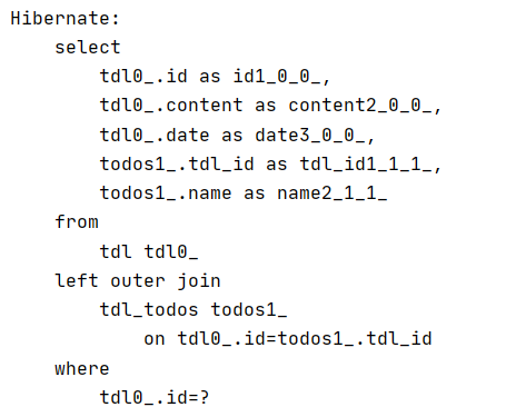 EAGER답게 todo에 대한 어떤 요청도 하지 않고 TDL 객체만 가져다 달라고 요청했는데 left outer join으로 TDL 테이블에 ToDo에 대한 정보를 붙여서 가져왔다.