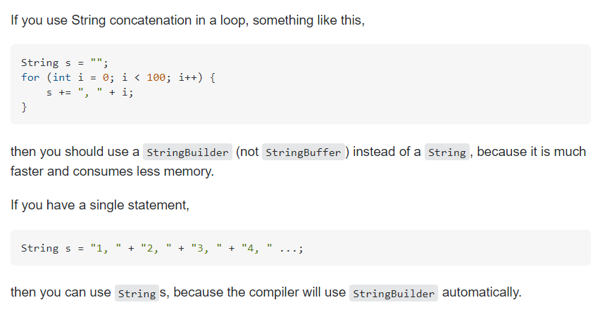 위의 사진은 stackoverflow의 한 답변이다. Single statement인 경우 컴파일러가 자동으로 StringBuilder를 이용하여 연산할 수 있지만, 반복문인 경우는 최적화하지 못하므로 사용자가 StringBuilder를 사용해주는 게 좋다는 내용이다.