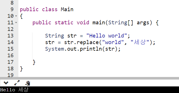 replace를 호출했다고 해서 str이 변하지 않는다. 왜냐하면 String은 immutable이기 때문이다. str이 가지고 있는 문자열을 교체해주고 싶다면, 정확히는 교체한 효과를 갖게하고 싶다면 replace가 리턴해주는 문자열을 받아야 한다.
