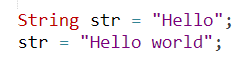 위와 같이 "Hello"를 담고 있는 str이라는 변수에 "Hello world"를 대입해주면 어떤 일이 벌어질까? "Hello"가 있던 공간에 " world"를 추가하는 것이 아니라 "Hello world"라는 새로운 문자열을 갖게 된다. 정확히는 str이 "Hello"가 있는 메모리 공간을 가리키던 상황에서 "Hello world"가 있는 메모리 공간을 가리키게 된다. (만약 위의 상황에서 String str2 = "Hello world"; 라는 코드를 추가한다면 이때 str2와 str1은 같은 곳을 가리키게 된다. 참고: Java String literal과 new String()의 차이(동일성과 동등성))