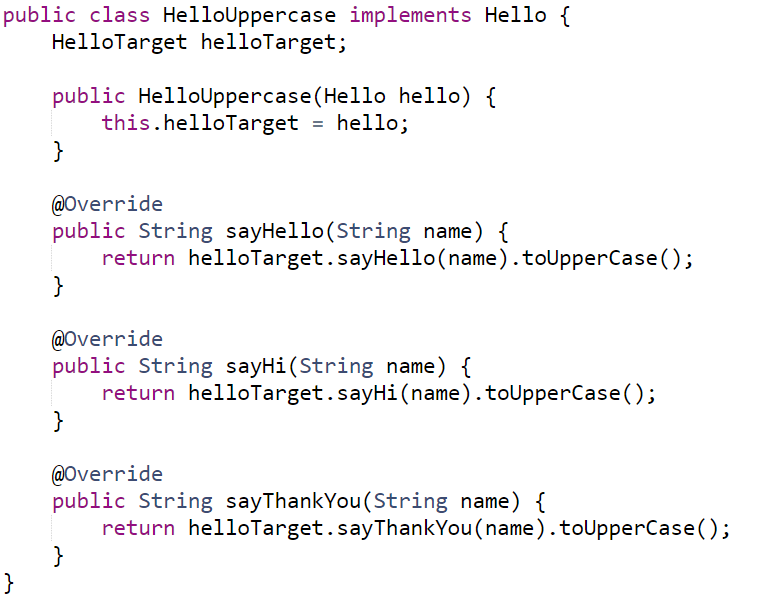 HelloUppercase라는 프록시를 직접 만들었다. 코드를 보면 세 개의 메소드 모두 리턴하는 문자열을 대문자로 바꿔주는 똑같은 일을 한다. 같은 일을 하는 건 좋은데 문제는 중복이 보인다는 것이다. 별도의 메소드로 분리함으로써 중복을 제거하는 것을 고려해볼 수 있다. 하지만 대문자로 바꿔주는 추가 기능이 Hello의 구현체 뿐만 아니라 다른 클래스에서도 필요한 경우라면 중복을 제거하기 곤란하다.