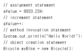 러프하게 보면 statement는 코드를 구성하는 하나하나의 문장(가독성을 위해 여러 줄로 나눈 문장 말고 세미콜론으로 끝나는 완전한 문장)이라고 볼 수 있다. 다음의 expression에 세미콜론을 붙이면 statement가 된다.