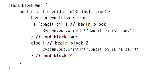 Block은 statments의 집합이다. (공집합도 block이다.) 중괄호로 표현하며 statement가 허락되는 곳이면 어디든 block이 사용될 수 있다.