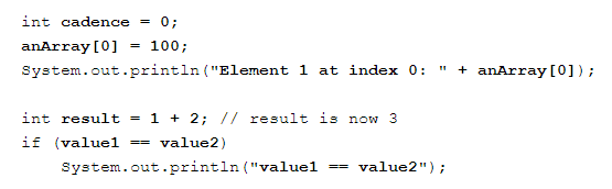 위의 코드를 조금 더 자세히 살펴보자. 코드의 첫 줄에 존재하는 expression 'cadence = 0'은 세 개로 구성되어 있다. 'cadence'라는 변수, 연산자 '=', 프리미티브 값 0. 'cadence'도 그 자체로 하나의 expression이고, 프리미티브 값 0도 그 자체로 하나의 expression이다. 연산자 '='에 의해 두 expression은 하나의 expression으로 합쳐지며 'cadence = 0'이라는 expression이 되었다.