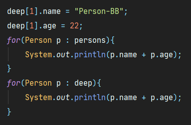 얕은 복사를 통해 복사되는 것은 참조변수(객체의 주소)뿐이므로 얕은 복사를 통해 만들어진 copy와 persons는 같은 Person 객체를 가리키고 있다. 따라서 copy에서 Person 객체의 값을 조작한다면 이는 persons의 Person 객체에도 영향을 미친다. 둘은 같은 객체이기 때문이다.