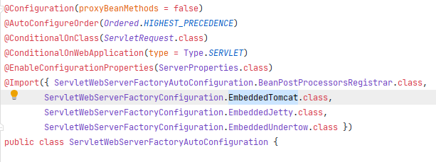 이 클래스는 ServletWebServerFactoryConfiguration의 EmbeddedTomcat을 import한다.