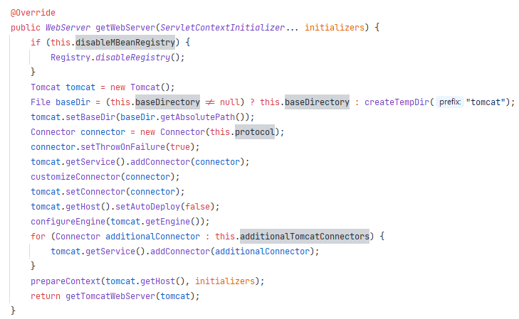 TomcatServletWebServerFactory의 getWebServer를 보면 톰캣을 만드는 코드가 보인다.