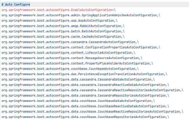 main 메소드가 실행이 되면 정해진 17개의 경로에서 수많은 프로퍼티들을 읽는다. 이 중에는 org.springframework.boot:spring-boot-autoconfigure의 META-INF/spring.factories도 있는데, @SpringBootApplication에는 @EnableAutoConfiguration 어노테이션이 붙어 있으므로 spring.factories의 모든 AutoConfiguration을 읽어들인다.