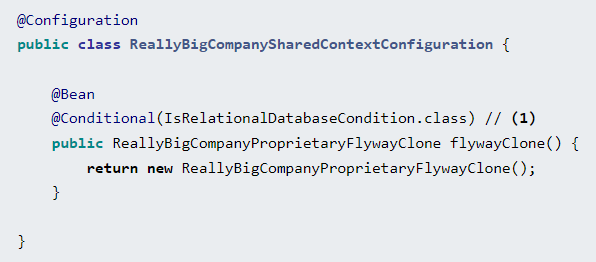 회사에서 신규 Spring 프로젝트를 시작해야 하는데, 대부분의 bean은 역시 공통되므로 공유되는 Configuration을 사용하고 싶으나 신규 프로젝트에서는 관계형 데이터베이스를 사용하지 않아서 ReallyBigCompanyProprietaryFlywayClone은 빼고 싶을 수 있다.