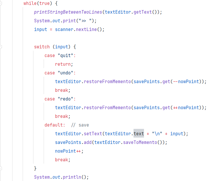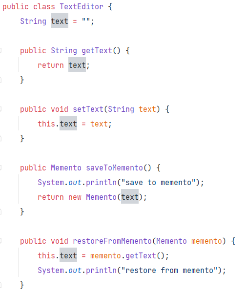 먼저 originator에 해당하는 텍스트 에디터 클래스이다. Originator는 메멘토 객체를 생성하거나(saveToMemento) 메멘토 객체를 받아 그 시점으로 돌아갈 수 있다(restoreFromMemento).