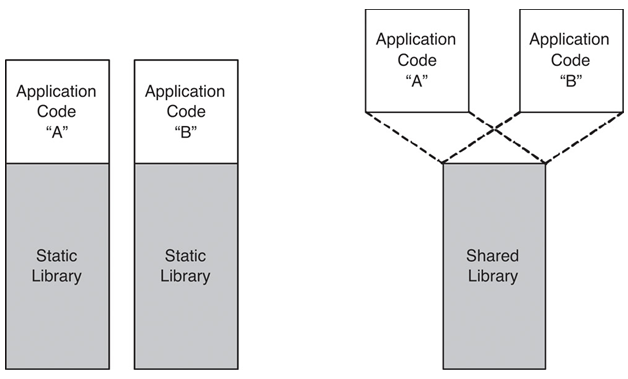 이번 시간에는 정적 링킹과 동적 링킹의 차이에 대해 이해해보자. 아래의 그림에서 왼쪽은 정적 링킹 방식이고 오른쪽은 동적 링킹 방식이다. 먼저 글을 찬찬히 읽은 뒤 다시 그림을 살펴보는 것이 좋겠다.